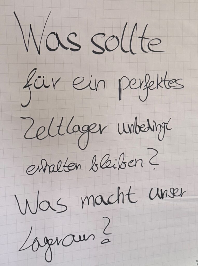 Am Samstag ging dann nach dem Frühstück die Arbeit los und zwar mit dem Rückblick auf das vergangene Lager – das angesprochene „Alte“. Wo haben die Gruppenleiter:innen Probleme festgestellt, wie können diese behoben werden, um das kommende Lager zu verbessern. Natürlich haben wir auch besprochen, was uns gut gefallen hat, was war schön und was muss so bleiben, damit das nächste Lager wieder schön wird.