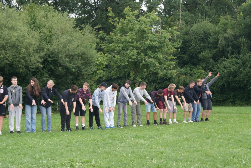 Plötzlich hat es gegöngelt. Dann haben wir gegessen. Dann haben Mülltonnen gemacht und dann haben wir Kennenlernspiele gespielt.
