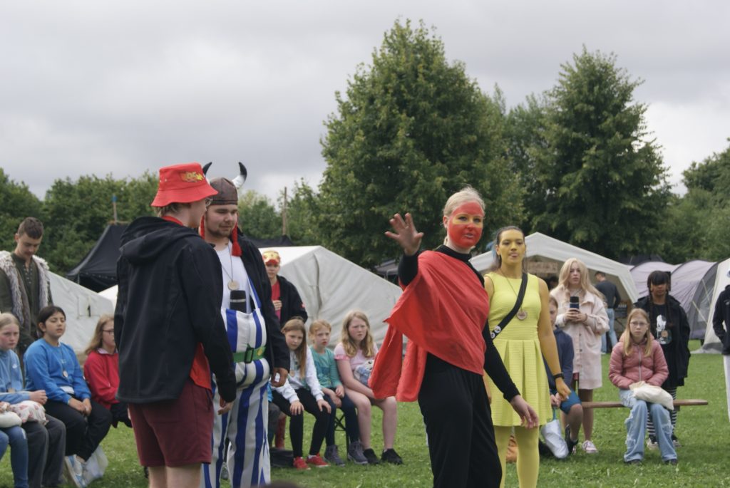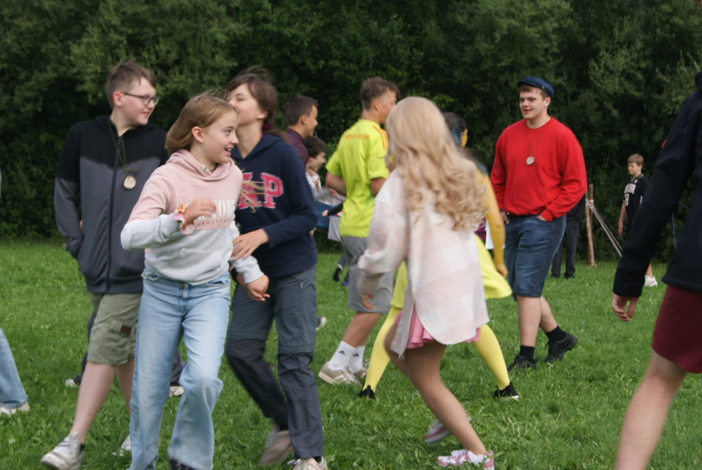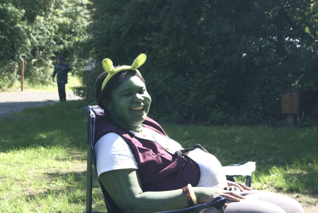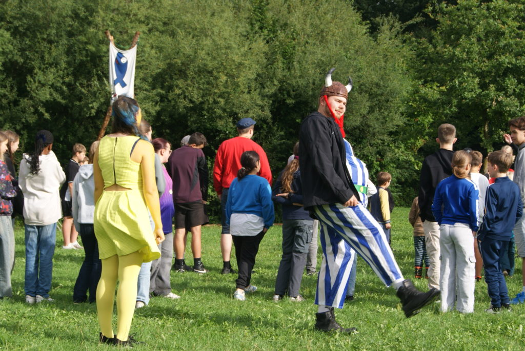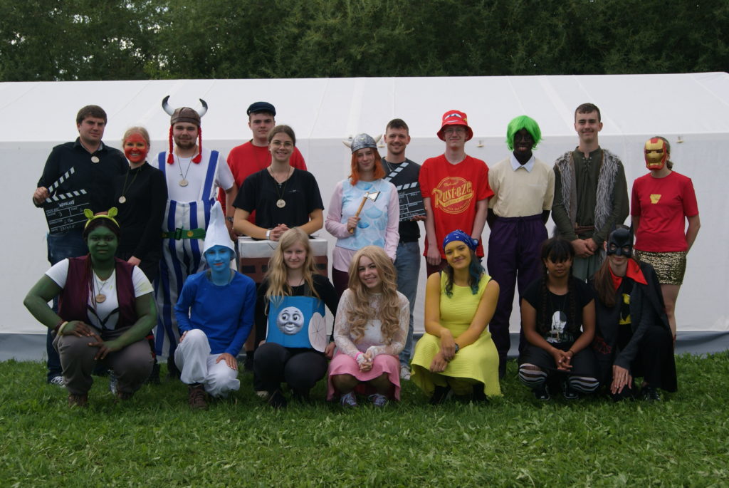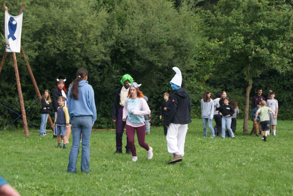 Heute morgen wurden wir alle mit dem Morgenradio geweckt und begaben uns kurz danach zum Frühstück. Außerdem stellten wir fest, dass alle Gruppenleiter sich als Figuren auf Filmen und Szenen verkleidet hatten.