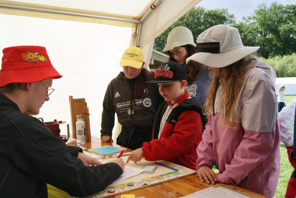 Nach dem Stationslauf konnten wir uns erst einmal über eine kleine Pause freuen, bis es dann zum Mittagessen gongte. Nach dem Mittagessen, bei dem es Geschnetzeltes gab, ging es mit einer Art Rollenspiel weiter, bei den verschiedenen Film- und Serienfiguren Grundstücke erspielen konnten.